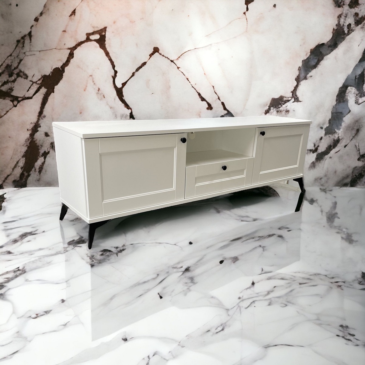 W tej samej kolorystyce i stylistyce dostępna jest też komoda RTV Classic z półkami i drzwiczkami, ale bez szuflady.
