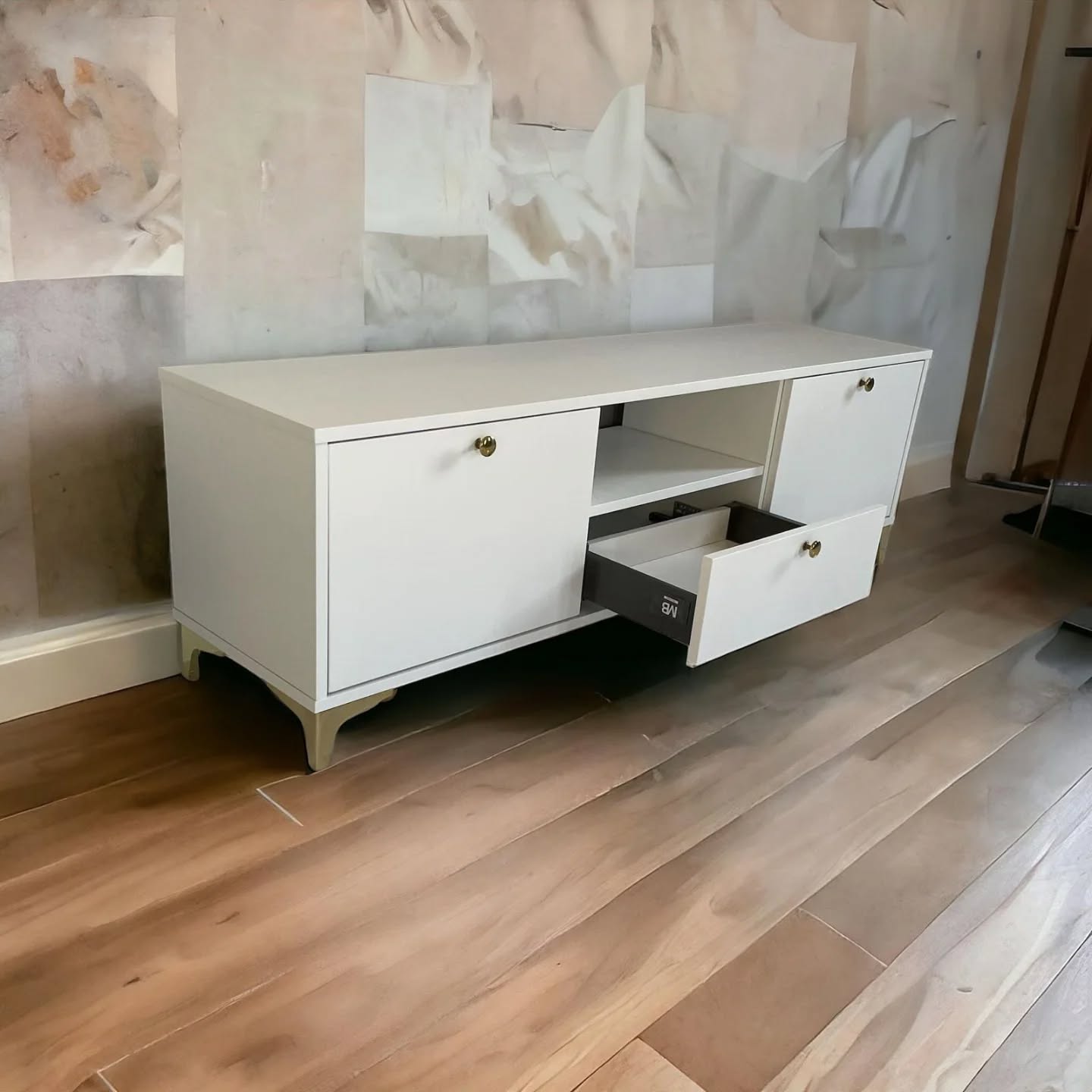 Zwróć uwagę na nóżki, na których stoi komoda Classic. Mają nowoczesny kształt, przypominający literę L i są w kolorze złotym – tak samo jak proste, eleganckie gałki umieszczone na drzwiczkach. Chcesz mieć inne dodatki? Nie ma problemu. Możesz je wybrać z naszej oferty.