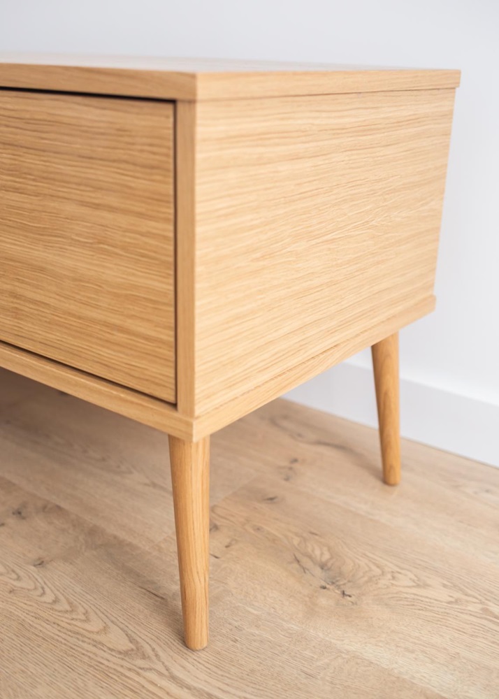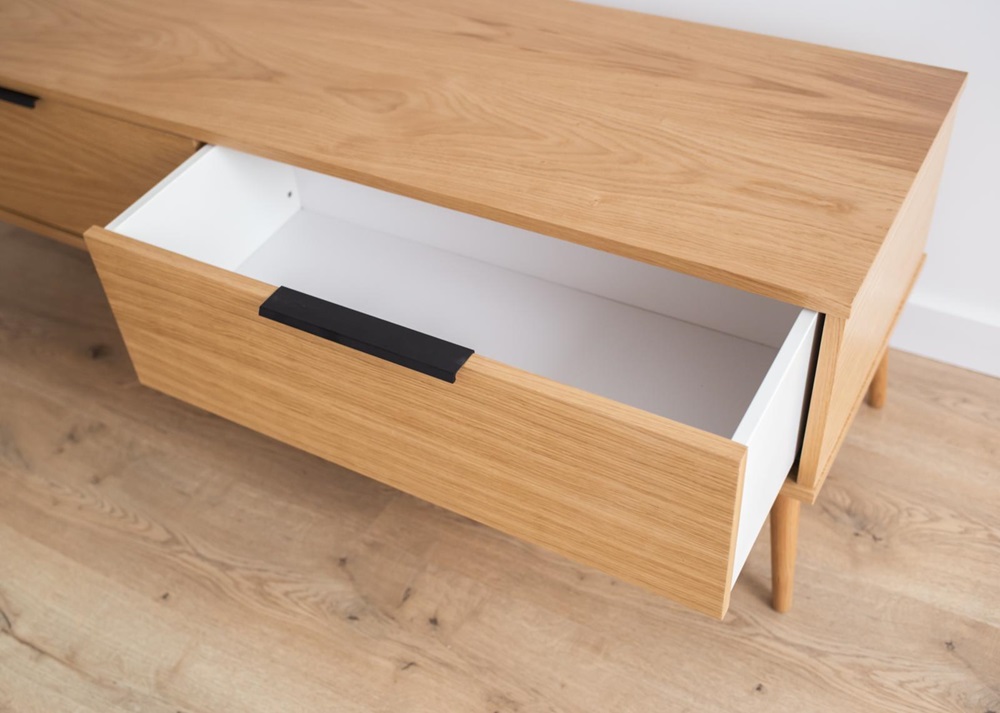 Komoda Malmo wykonana jest z płyty meblowej fornirowanej w naturalnej okleinie dębowej. Wyposażona jest w dwie szuflady z pełnym wysuwem. Korpus umieszczony jest na patykowatych nóżkach z drewna dębowego,