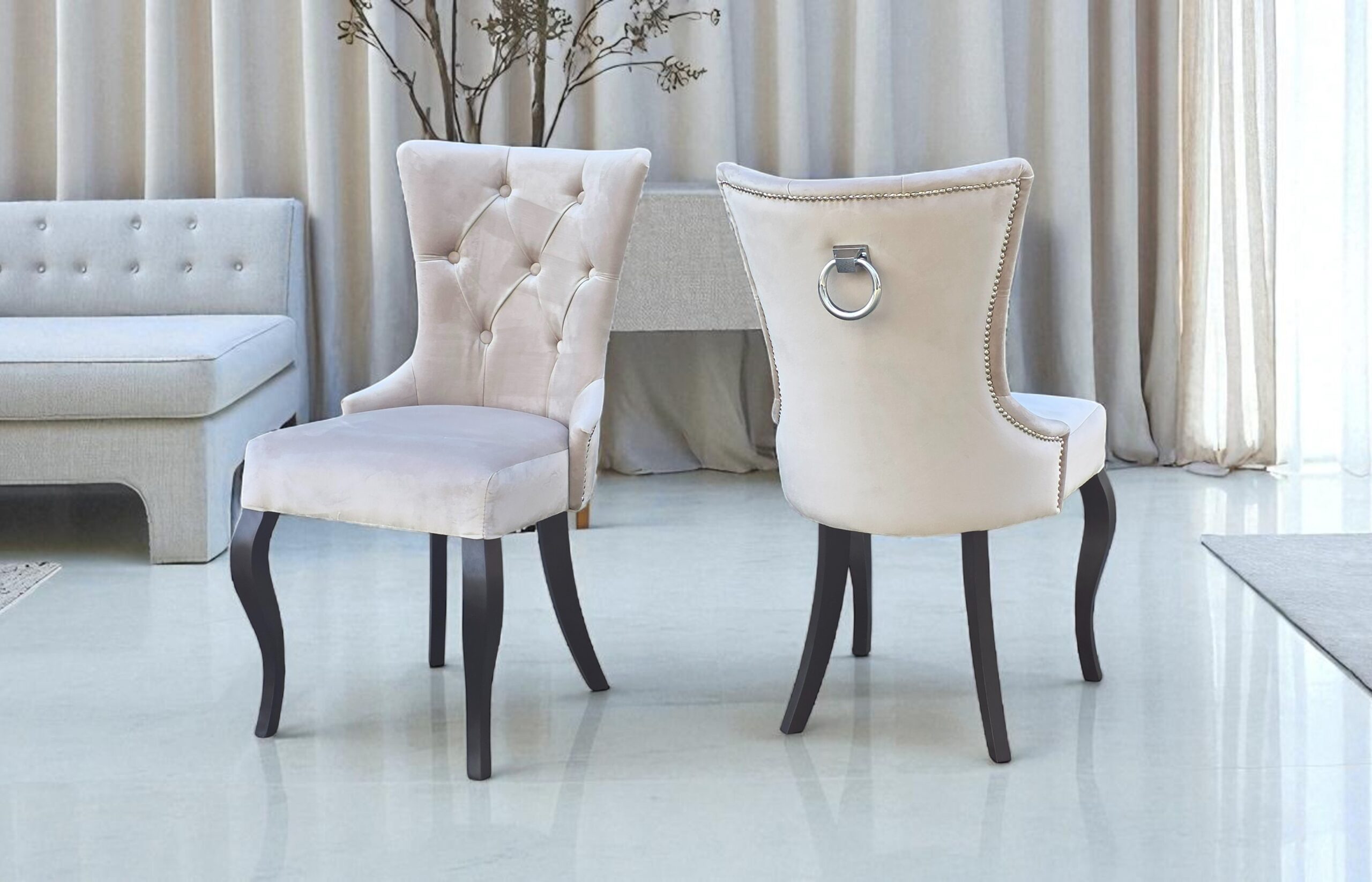 Krzesła Dubai wykonane są na drewnianym stelażu. Posiadają czarne nogi w stylu ludwikowskim. Mebel obity jest wysokiej jakości tkaniną Magic Deluxe w kolorze kremowym, która jest elegancka i łatwa do utrzymania w czystości. Wystarczy przetrzeć mebel wilgotną szmatką.
