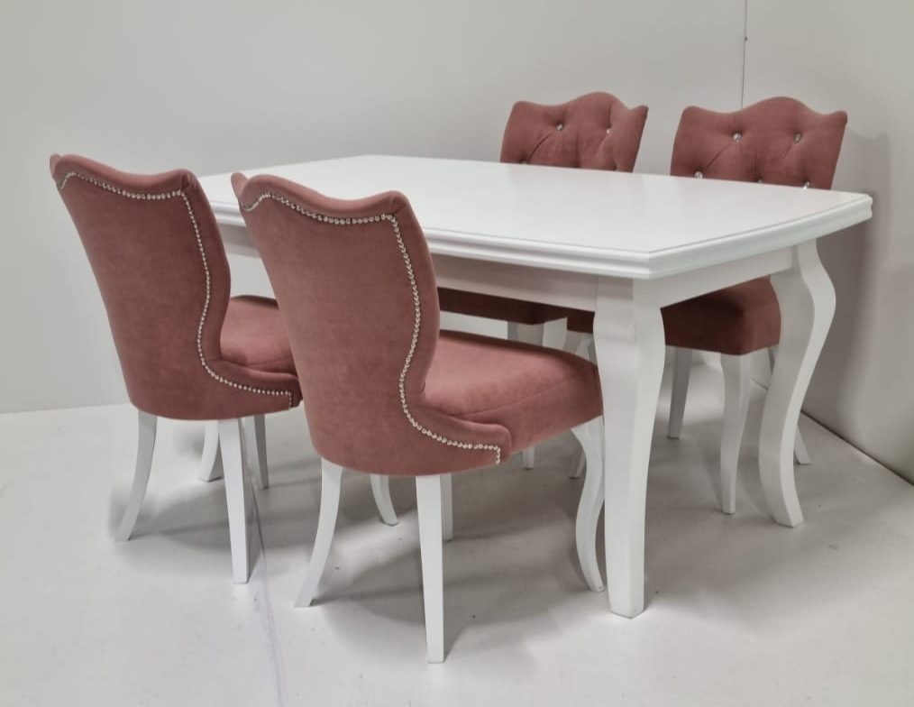 Krzesła Roma wykonane są na drewnianym stelażu. Posiadają proste i gięte nogi w kolorze białym. Mebel obity jest wysokiej jakości tkaniną Magic Velvet 2258 w ciepłym odcieniu różu. Materiał jest elegancki i łatwy do utrzymania w czystości; wystarczy przetrzeć wilgotną szmatką.