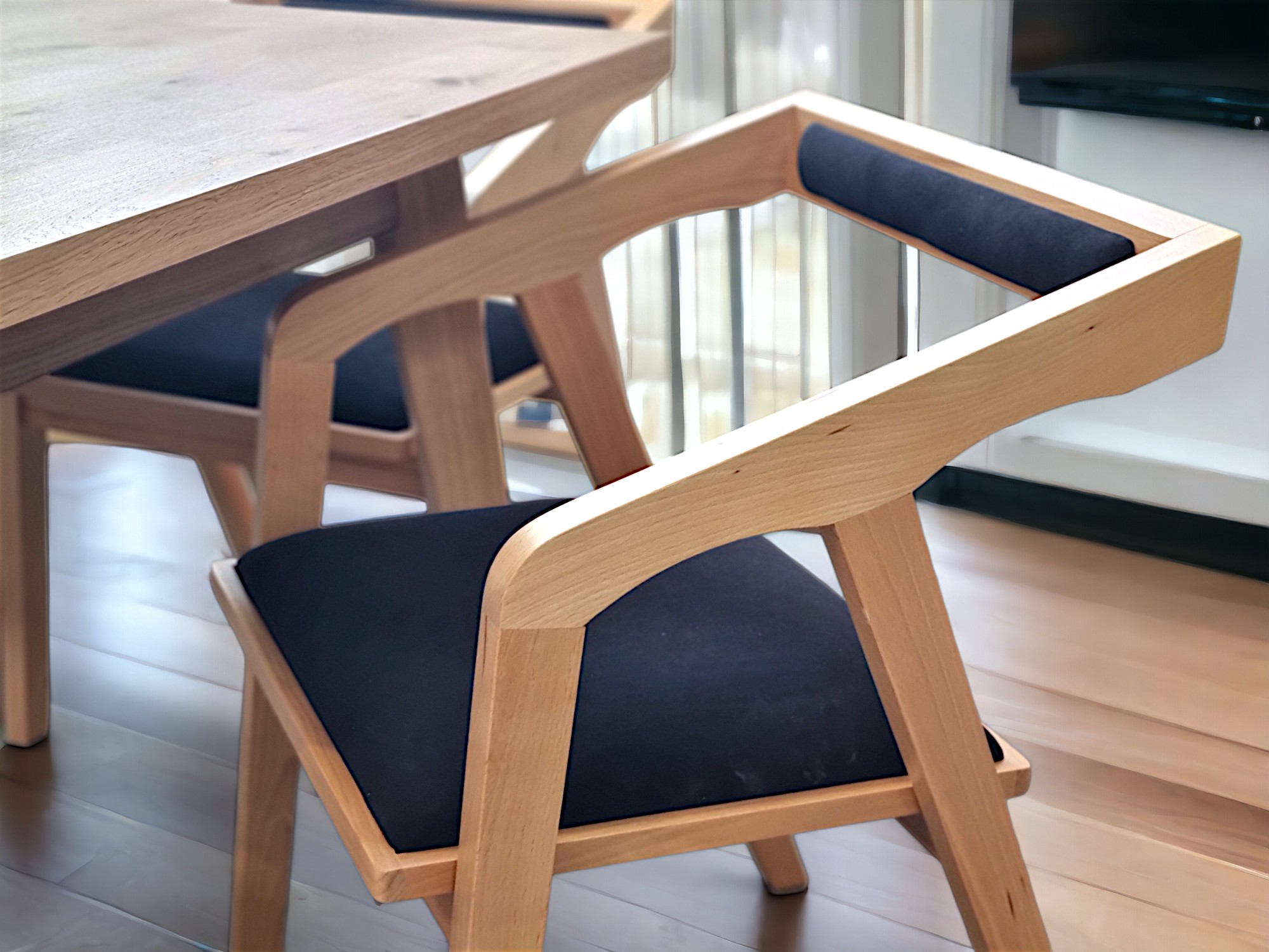 Wygodne siedzisko to nie tylko bukowy materiał, ale także tapicerka. Na zdjęciach prezentujemy krzesło Bergen z siedziskiem, wykonanym z materiału w kolorze bardzo modnej czerni oraz delikatnie tapicerowane oparcie. Odcień ten idealnie współgra z dębowym drewnem. Takie krzesła możesz zestawić ze stołami Oslo lub Oslo II, również produkcji Meble Tuszkowski. Podobnie jak krzesła Bergen mają one prosty, loftowy design. Sprawdzą się też we wnętrzach industrialnych.