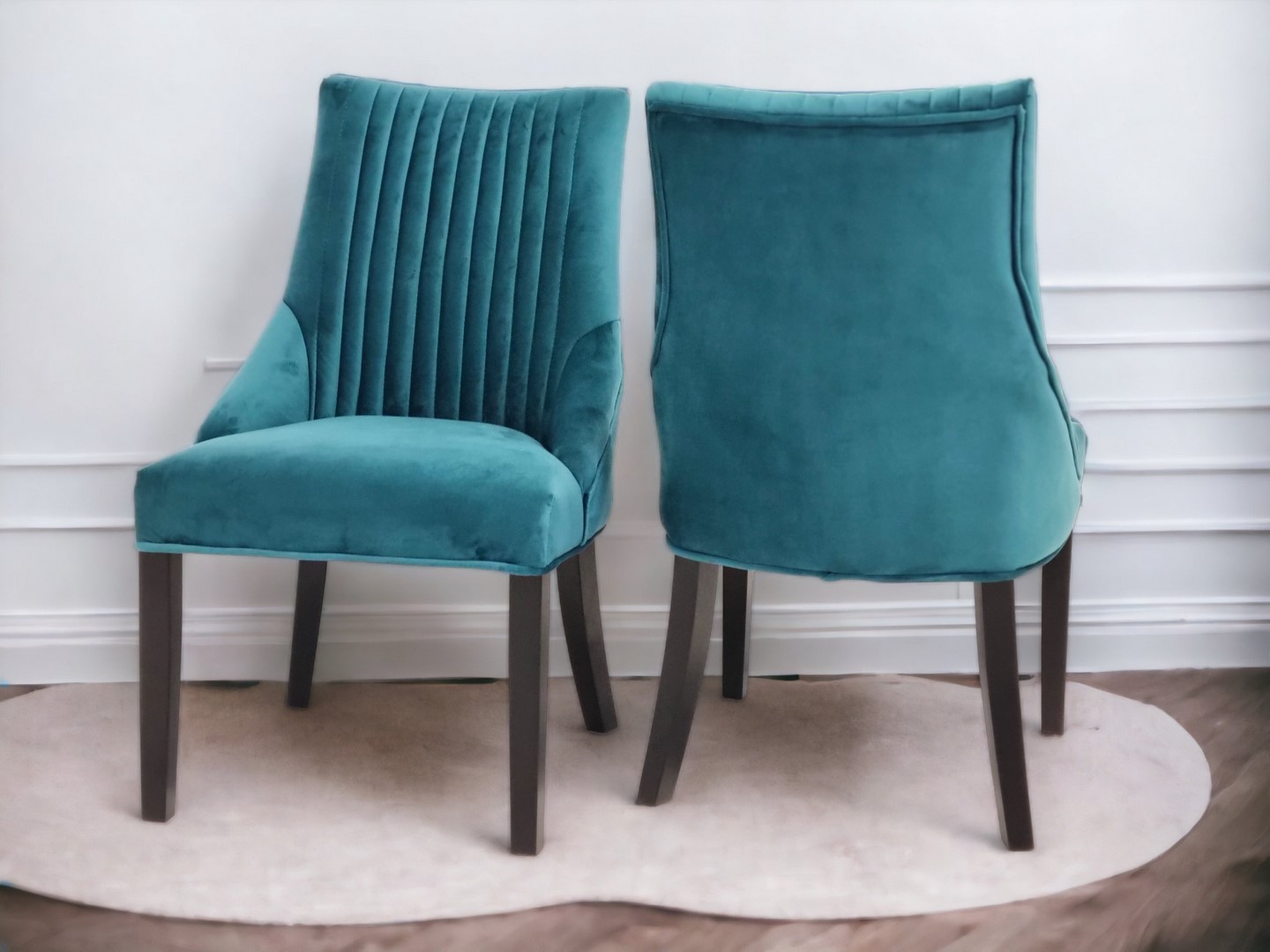 Na zdjęciach prezentujemy komplet składający się z drewnianego stołu Sandro II o prostokątnym blacie i patykowatych nogach. Krzesła tapicerowane Bari Modern posiadają proste nogi, natomiast oparcie posiada nowoczesne, pionowe przeszycia. Obicie wykonane jest z plamoodpornej tkaniny typu velvet.