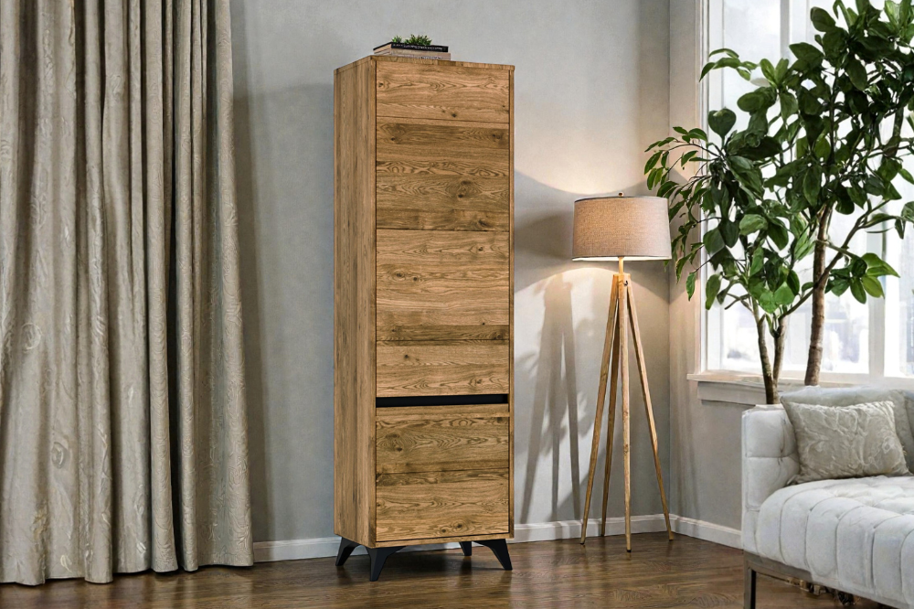 Szafa dębowa o szerokości 60 cm to rozwiązanie idealne tam, gdzie liczy się każdy centymetr. Model o realnej szerokości 62,5 cm wykorzystuje pionową przestrzeń pomieszczenia, dlatego sprawdza się w sypialni, przedpokoju lub w niewielkim pokoju dziennym. Dzięki wysokości 203 cm zyskujesz dużo miejsca do przechowywania bez zajmowania dużej powierzchni podłogi.