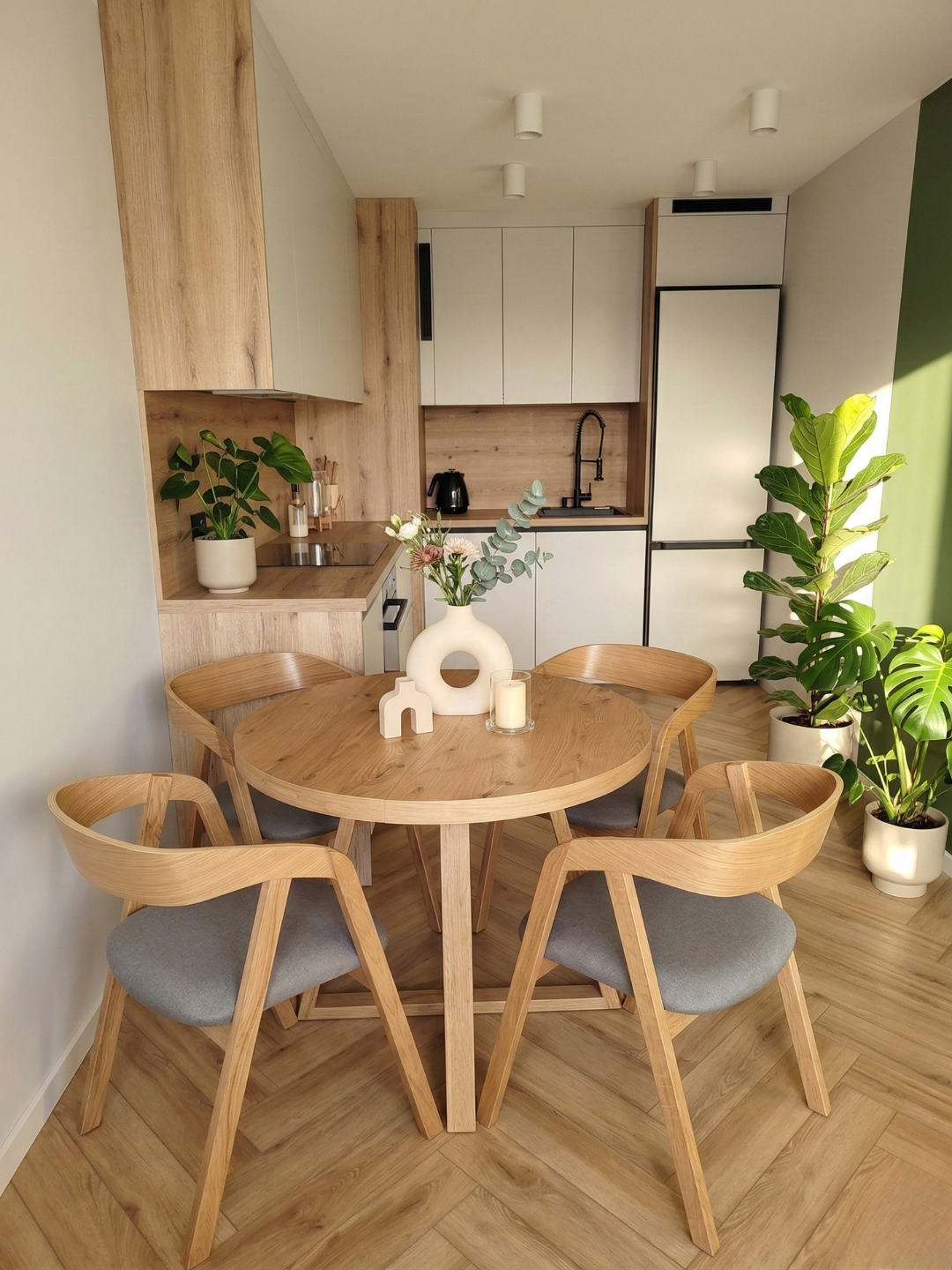 Komplet składa się z okrągłego stołu Carlo, który ma nogi z drewna dębowego i blat z płyty MDF w naturalnej okleinie dębowej – zwróć uwagę na niepowtarzalne, harmonijne usłojenie. Podkreśli je odpowiednie wybarwienie drewna np. w odcieniu Dąb Naturalny lub ciemniejszym jak ciemny kasztan. Możesz też zdecydować się na barwy takie jak biel, czerń lub modny stół kaszmir.