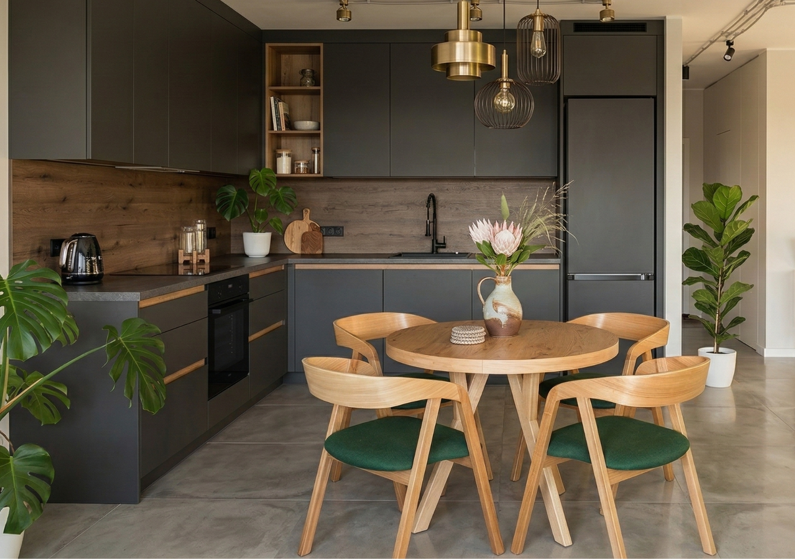 • wybarwienie drewna – osobno wybierasz kolor drewna krzeseł, stołu oraz barwę blatu; ponieważ blat możemy wykonać w zupełnie innym kolorze – np. czarnym, dębowym, szarym lub innym, który wybierzesz.